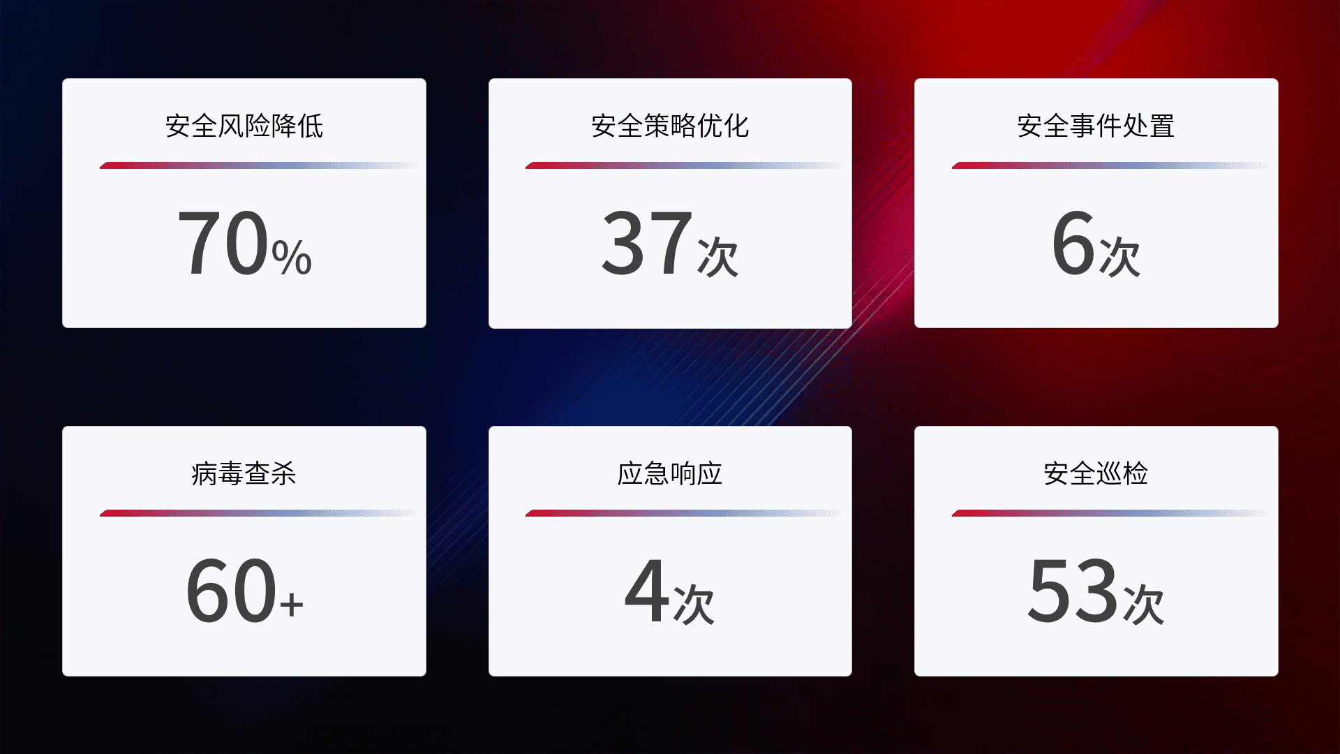 综合报告与文档服务: 定期提供安全事件处置报告、、、、周/季度总结报告和年度总结报告;详尽的文档服务可帮助客户了解网络安全状况,,,,支持决策制定和流程优化。。。。